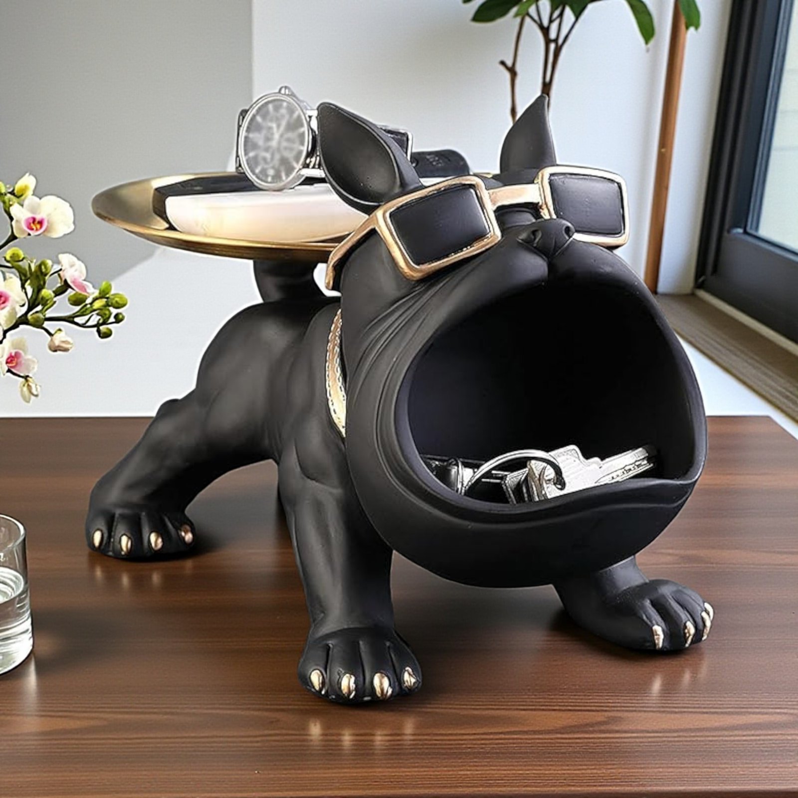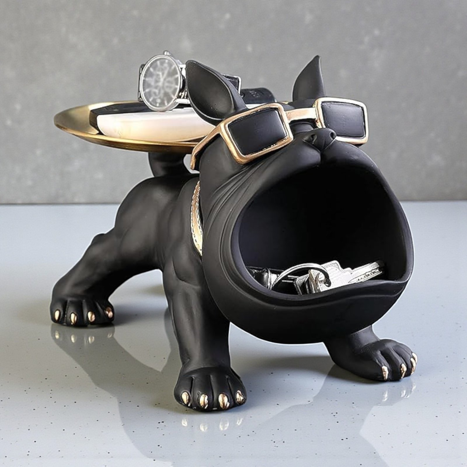 With a height of 25 cm, this bulldog showpiece is perfectly sized to stand out without overwhelming your space. It fits comfortably on living room consoles, side tables, office desks, shelves, bedside tables and entryway units. The attached tray is ideal for holding keys, coins, wallets, watches, earphones, rings, small accessories or other everyday essentials. Instead of cluttering surfaces, this dog figurine organizer keeps items neatly in one place while looking decorative and stylish.